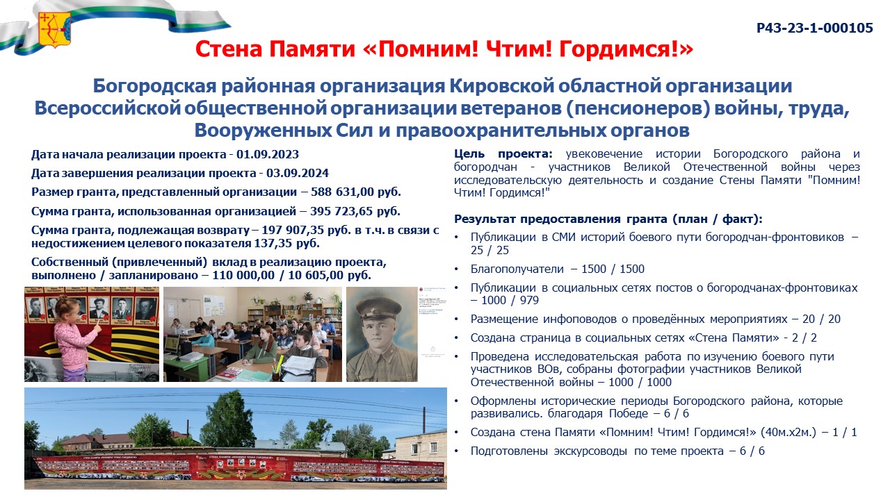 информация о выполнении календарного плана мероприятий проекта, достижении целевых показателей проекта "Стена Памяти "Помним! Чтим! Гордимся!" |