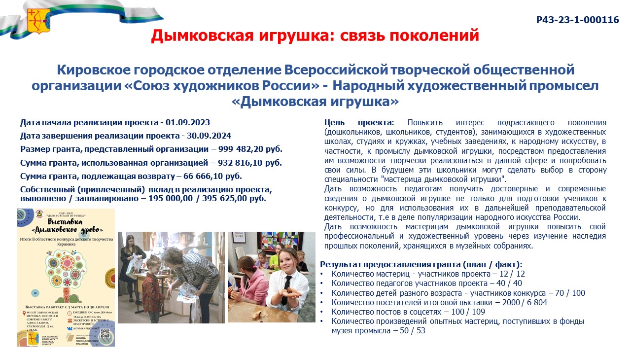 информация о выполнении календарного плана мероприятий проекта, достижении целевых показателей проекта "Дымковская игрушка: связь поколений" |