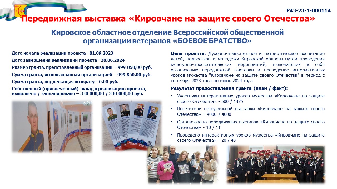 информация о выполнении календарного плана мероприятий проекта, достижении целевых показателей проекта "Передвижная выставка "Кировчане на защите своего Отечества" |