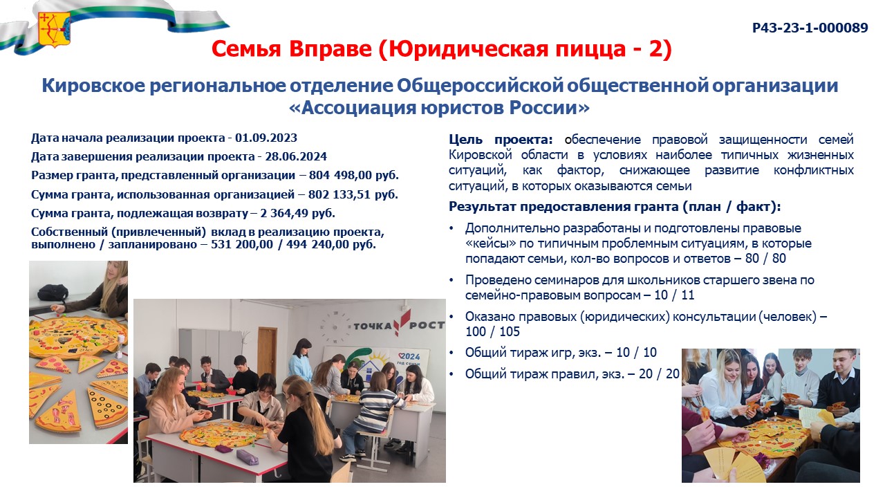 информация о выполнении календарного плана мероприятий проекта, достижении целевых показателей проекта "Семья Вправе (Юридическая пицца - 2)" |