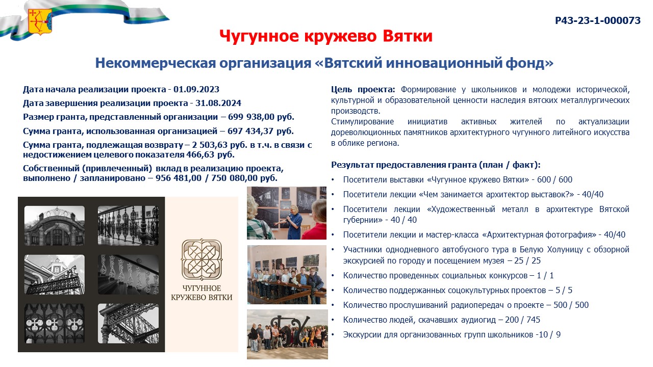 информация о выполнении календарного плана мероприятий проекта, достижении целевых показателей проекта "Чугунное кружево Вятки" |