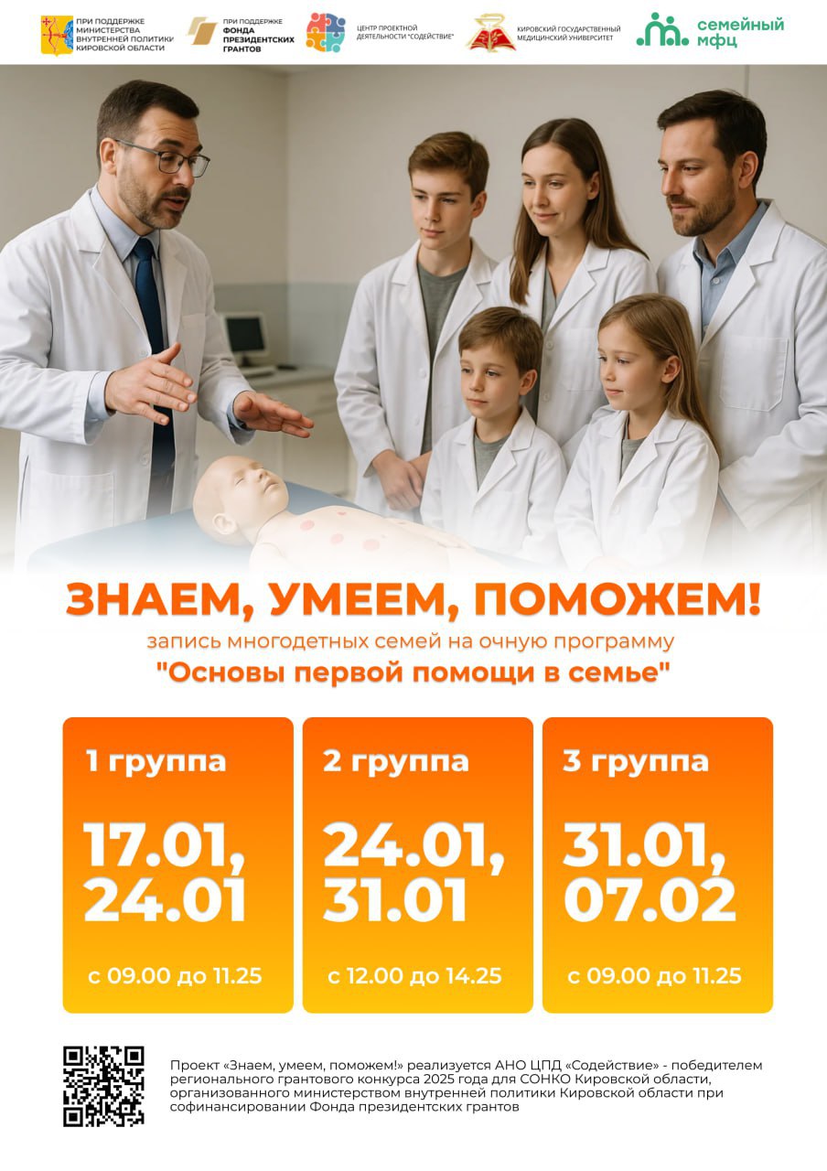 Приглашаем многодетные семьи на обучение по программе «Основы первой помощи в семье» в рамках проекта «Знаем, умеем, поможем!»
