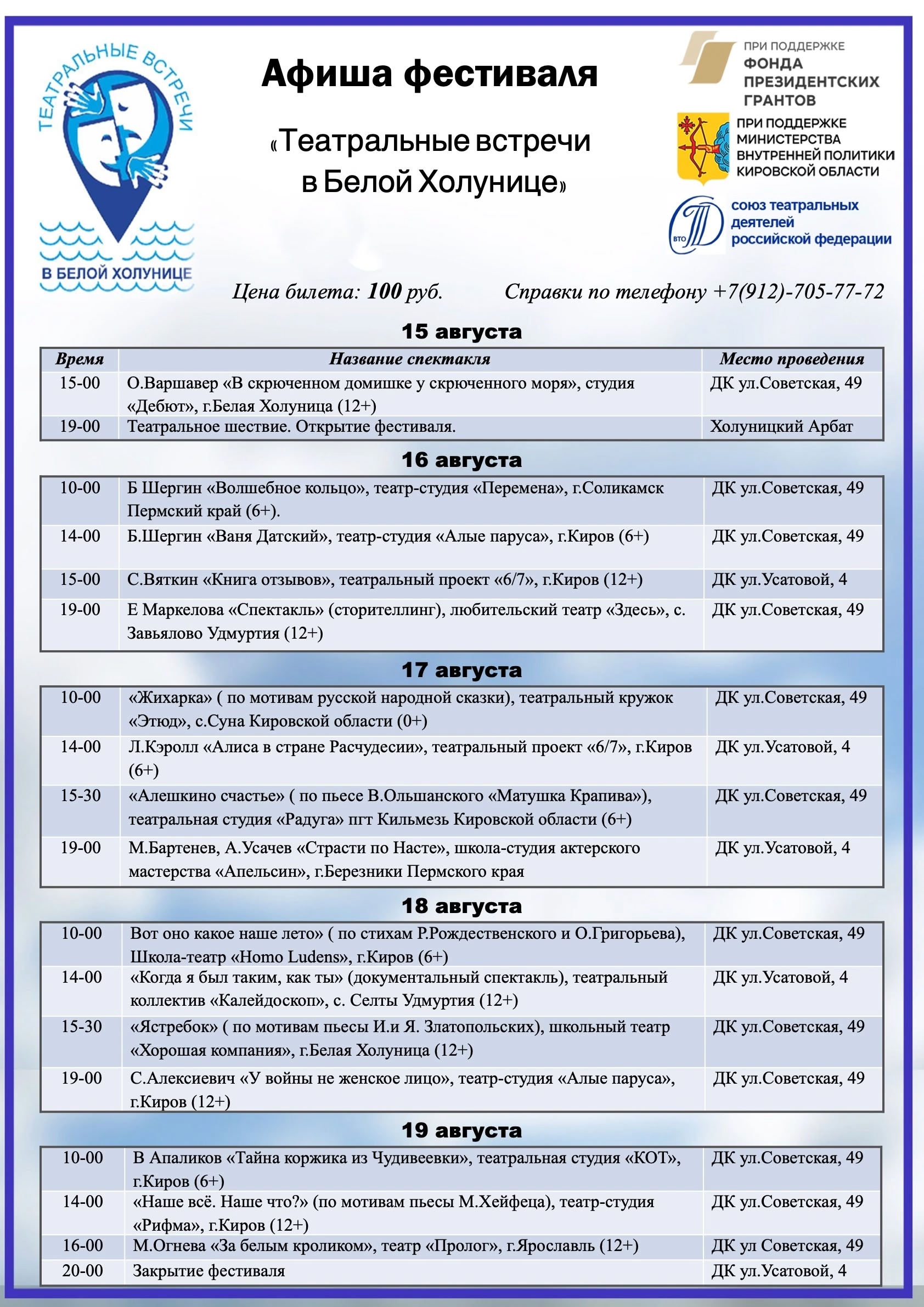 С 15 по 20 августа состоится заключительный этап Межрегионального фестиваля детских и молодежных любительских театров «Театральные встречи в Белой Холунице»!